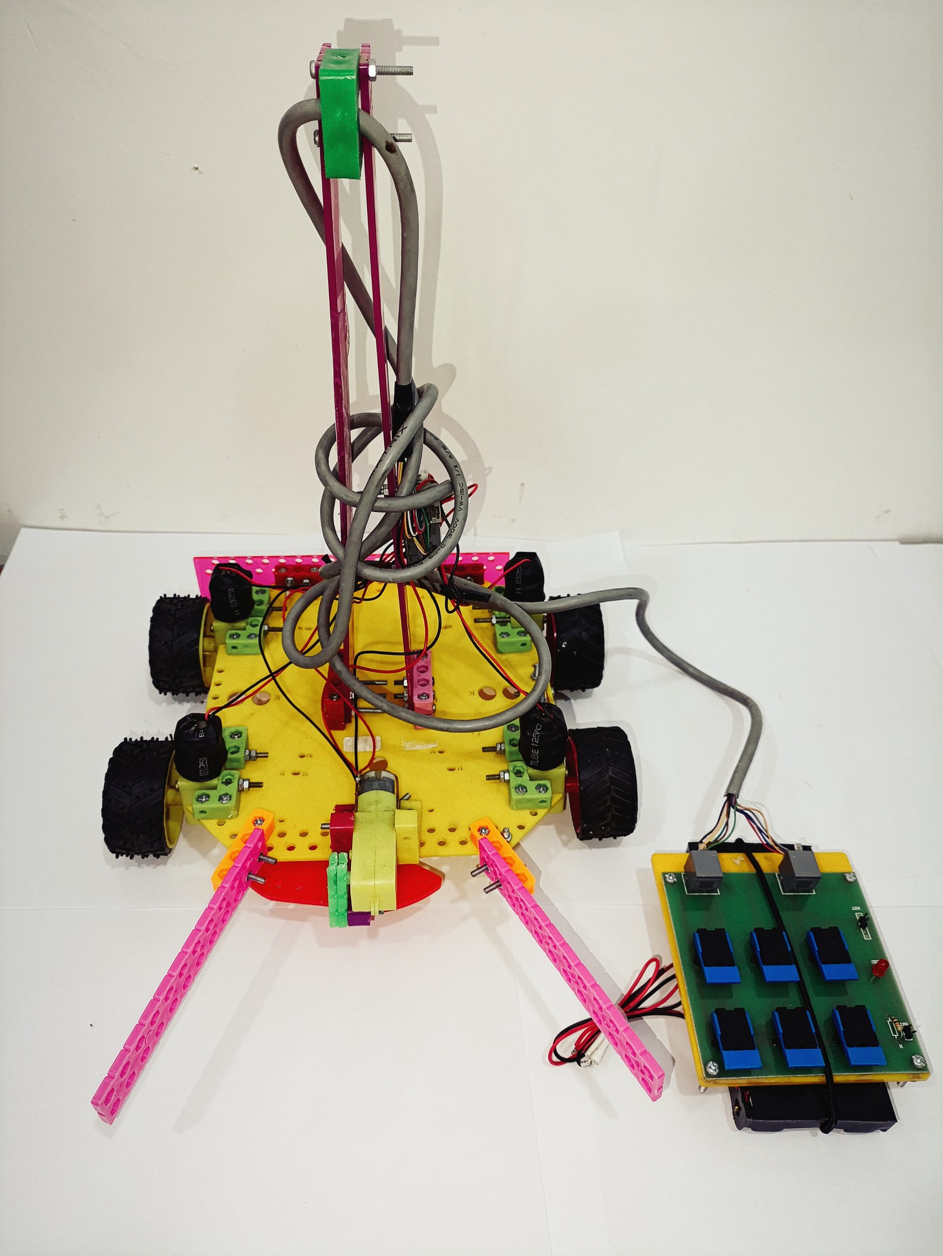 این ربات که تشکیل شده از فیبر مدار چاپی، مقاومت ها پین دوتایی، نری و مادگی تلفن، سیم تلفن،LED، کلید اهرمی و باتری می باشد ؛ امکان شناخت بهتر قطعات، یادگیری شماتیک های الکتریکی، ابزار الکتریکی، تقویت مهارت لحیم کاری و … را به دانش آموزان می دهد.