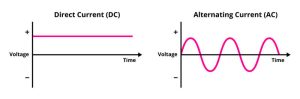 نیروی برق دو نوع مختلف دارد که یکی AC یا جریان متناوب است و دیگری جریان DC یا مستقیم است. مخترع برق AC نیکوال تس ال و مخترع برق DC توماس ادیسون میباشد. پریز های برق در تمام خانه ها و دفاتر از برق AC یا برق شهری استفاده میکنند به خاطر این که تولید و ارسال برق ACبه جاهای دور بسیار آسان است و برق کمتری در مسیر هدر می رود.هر چیزی که با باتری کار میکند یا توسط آداپتور مبدل جریان AC به DC به دیوار وصل میشود یا از کابل USB استفاده میکند DC است مانند تلفن های همراه، چراغ قوه و …. .